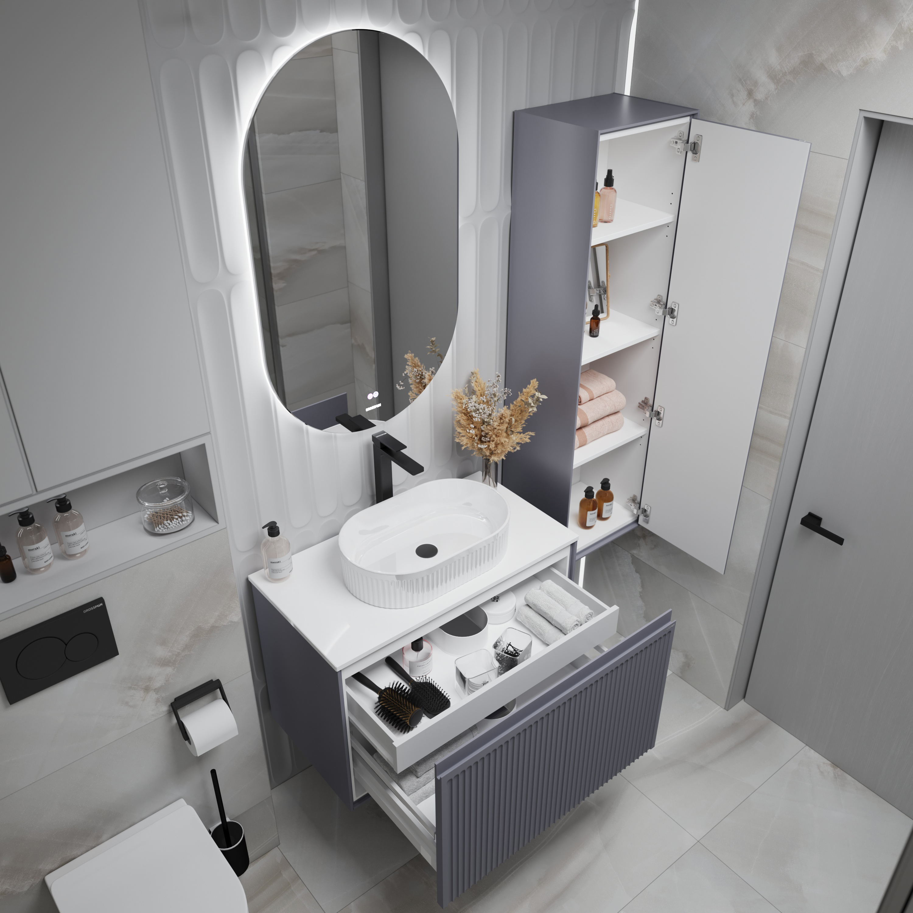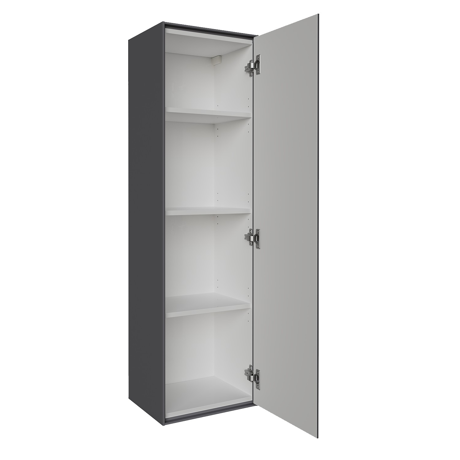 Подвесной пенал “КРИСТАЛЛ” 35 см, универсальный, графит матовый — компактный и стильный элемент мебели для ванной комнаты. Корпус и фасады выполнены из МДФ, окрашенного в цвет графит с матовым финишем. Фасад с вертикальным рифлением придаёт изысканный внешний вид, а безручечный дизайн и петли с доводчиком обеспечивают плавное и бесшумное закрытие.