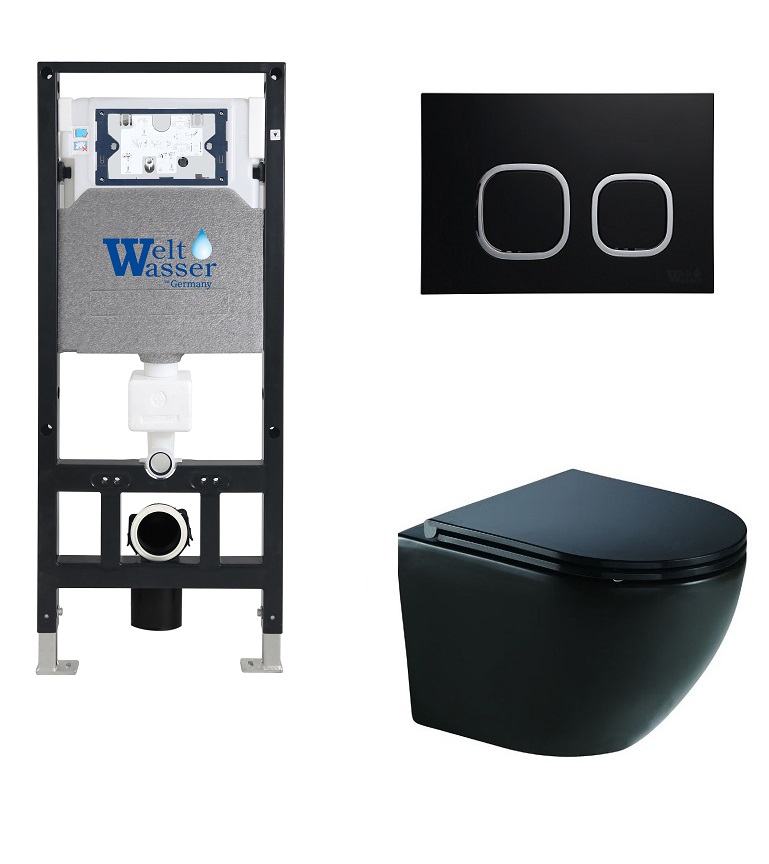 Унитаз от немецкого производителя WeltWasser. ИНСТАЛЛЯЦИЯ ДЛЯ ПОДВЕСНЫХ УНИТАЗОВ * Монтажная рама+бачок+кнопка смыва+уплотнитель * Окрас рамы порошковым напылением * Пластиковый бачок слива в пенопласте для бесшумного слива воды * Усиленная рама. Бесшовная внутренняя сварка рамы. * Регулируемая глубина до 35 мм. * Усиленные регулируемые ножки от 0 до 200 мм. * Крепление ножек к полу возможен в 4х вариантах. * Уплотнитель между плиткой и унитазом * Кнопка смыва 3/6 л * Подвод воды сверху и сзади. * Межосевое расстояние под крепеж унитаза 18 и23 см * Диаметр слива 90/110 мм. * Фановая труба в комплекте. * Установка в капитальную стену и в пол. * ПРЕИМУЩЕСТВО. Дополнительный крепеж посередине рамы * ДВОЙНАЯ ШУМОИЗОЛЯЦИЯ (бачок и труба). УНИТАЗ ПОДВЕСНОЙ БЕЗОБОДКОВЫЙ RIMLESS • УЛЬТРА ТИХИЙ СЛИВ ВОДЫ • Технология слива TORNADO • Антивсплеск • Горизонтальный выпуск • Скрытые крепления • Сиденье: тонкое, быстросъёмное, дюропласт с микролифтом. • Антибактериальное покрытие (технология PureGuard) препятствует размножению бактерий • Особая глазурь для легкой очистки отталкивает известковые отложения и загрязнения Клавиша смыва WeltWasser AMBERG: Кнопка смыва 3/6 л. Материал: ABS-пластик. Гарантия: унитаз - 5 лет; инсталляция - 10 лет; кнопка - 1 год.